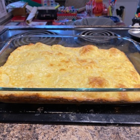 Seemed a little underdone after 45 minutes, gave it an extra 3. Oven wasn’t level so one side was thicker than the other. Buttered pan but it stuck a bit.